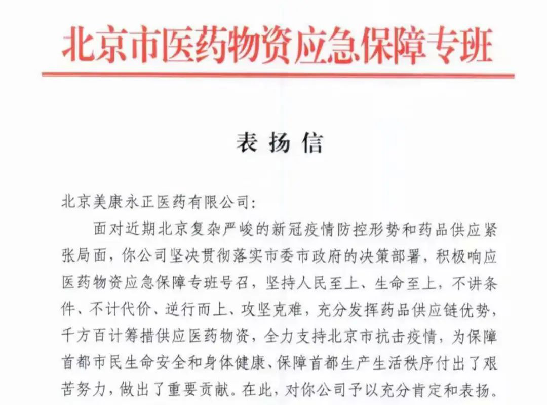 12月19日,在北京市新冠肺炎疫情防控工作第432场新闻发布会上,通用技术中国医药所属北京永正在保供北京防疫物资和人民群众用药方面发挥了购销主渠道作用,受到了点名表彰。北京市医药物资应急保障专班向通用技术中国医药所属北京永正发来感谢信,赞扬公司在支持北京市抗击疫情、保障首都市民生命安全和身体健康、保障首都生产生活秩序等方面作出的努力。