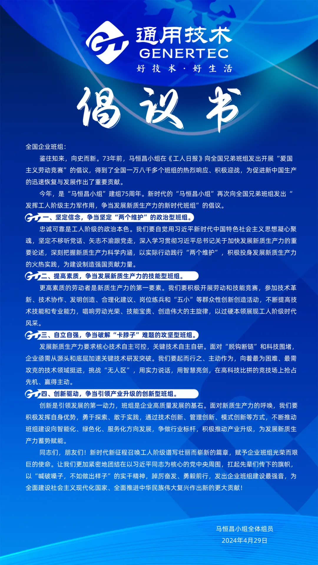 会上,马恒昌小组第十八任组长马兵代表马恒昌小组向全国企业班组发出“发挥主力军作用 争当发展新质生产力先行者”的倡议,号召全国兄弟班组:坚定信念,争当坚定“两个维护”的政治型班组;提高素质,争当发展新质生产力的技能型班组;自立自强,争当破解“卡脖子”难题的攻坚型班组;创新驱动,争当引领产业升级的创新型班组。